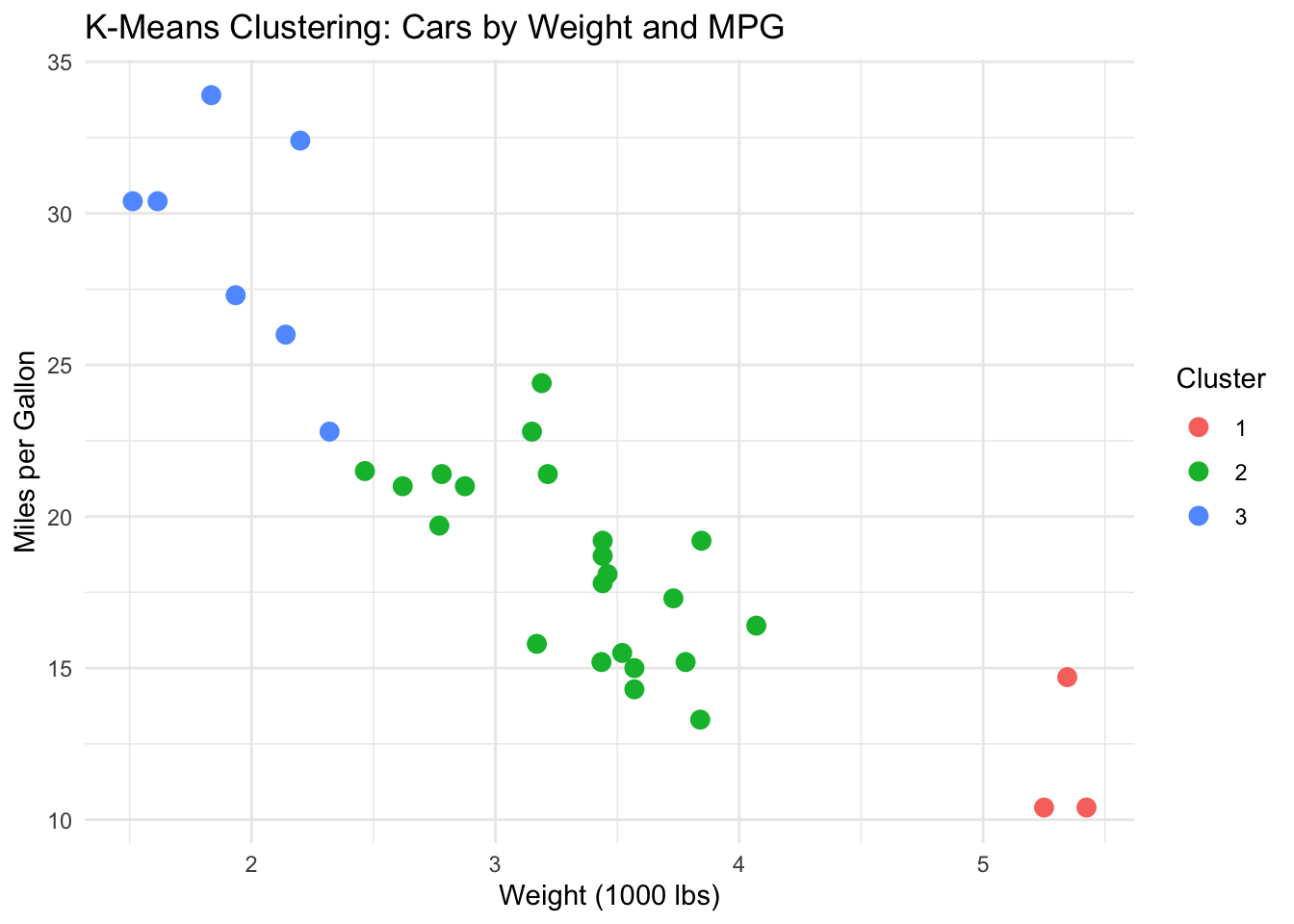 The algorithm discovers three natural groups without being told what they are — lightweight fuel-efficient cars, mid-range cars, and heavy gas-guzzlers. A BI analyst might apply the same technique to segment employees by absence patterns, customers by purchasing behavior, or products by sales characteristics.