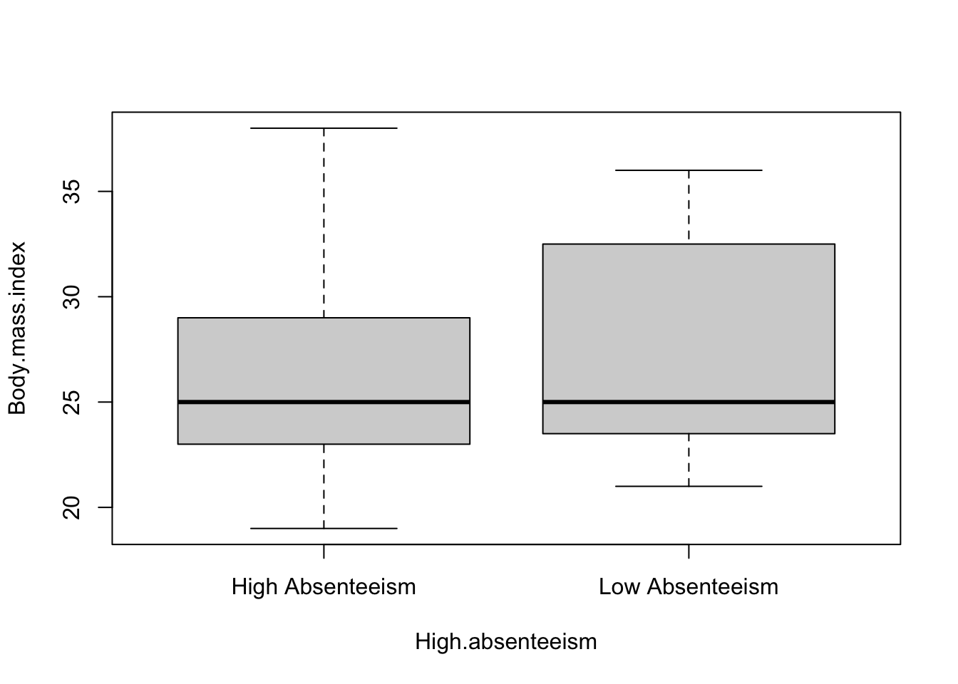 Visualization plays a pivotal role in data analysis, offering an intuitive understanding of data distributions and relationships. In this context, we utilize the boxplot function in R to create boxplots for two numeric variables, Body Mass Index (BMI) and Age, categorizing them by levels of absenteeism (high vs. low).