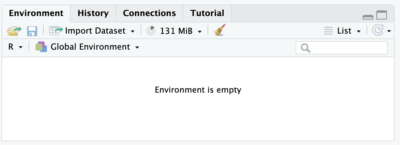 The top-right panel is the Environment/History Panel. The Environment tab displays all variables, data frames, and other objects in the current workspace. The History tab keeps a record of command history.