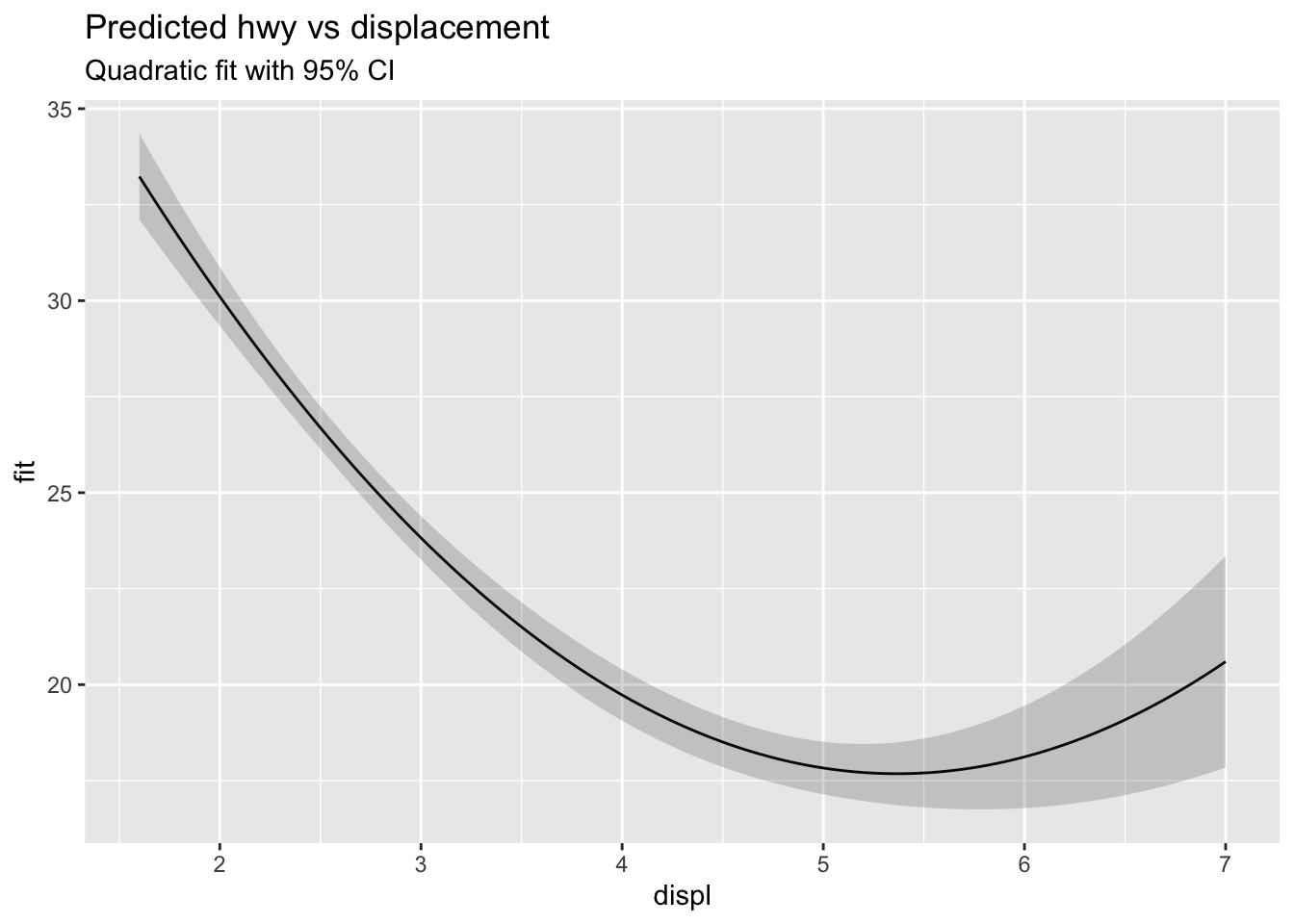labs (title = "Predicted hwy vs displacement" , subtitle = "Quadratic fit with 95% CI" )