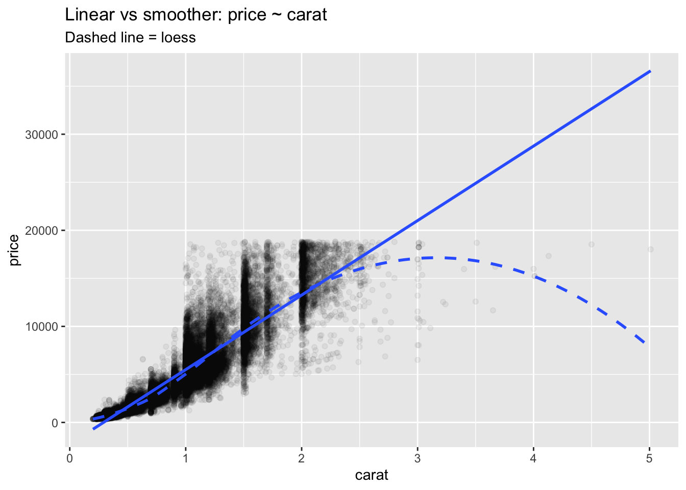 labs (title = "Linear vs smoother: price ~ carat" , subtitle = "Dashed line = loess" )