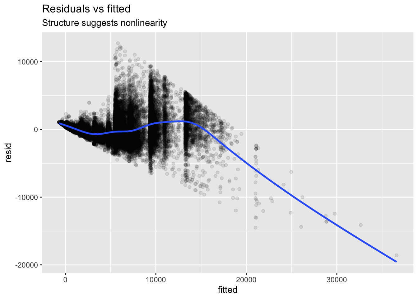 labs (title = "Residuals vs fitted" , subtitle = "Structure suggests nonlinearity" )
