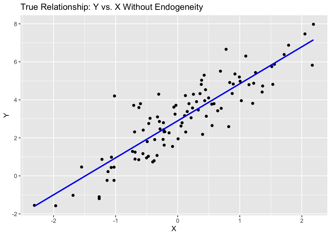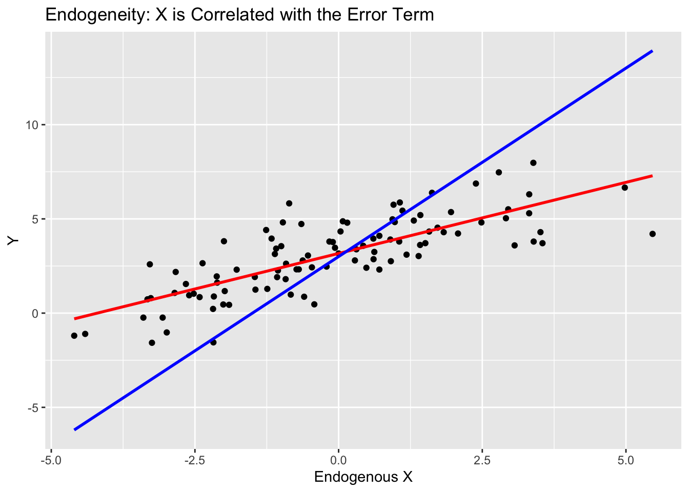 The scatter plot and fitted lines from the linear models highlight the bias introduced by endogeneity. The red line represents the OLS estimate, which is biased because\(x_{\text{endogenous}}\)is correlated with the error term. The blue line represents the true relationship between\(x\)and\(y\). This visualization illustrates how endogeneity can distort the true relationship between variables in a regression model, leading to misleading inferences.