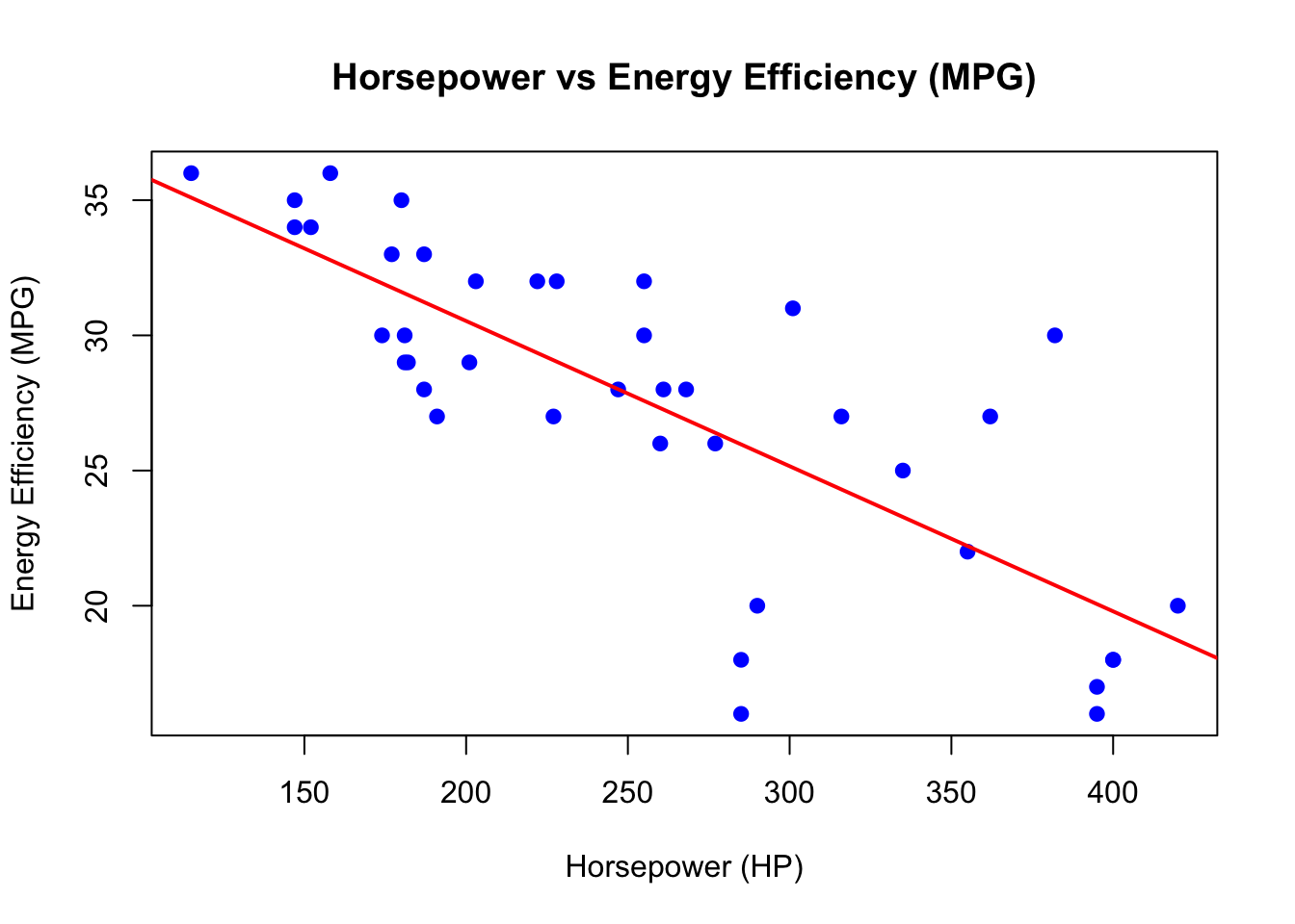 model <- lm(`Energy Efficiency (MPG)` ~ Horsepower, data = car_data_clean)
